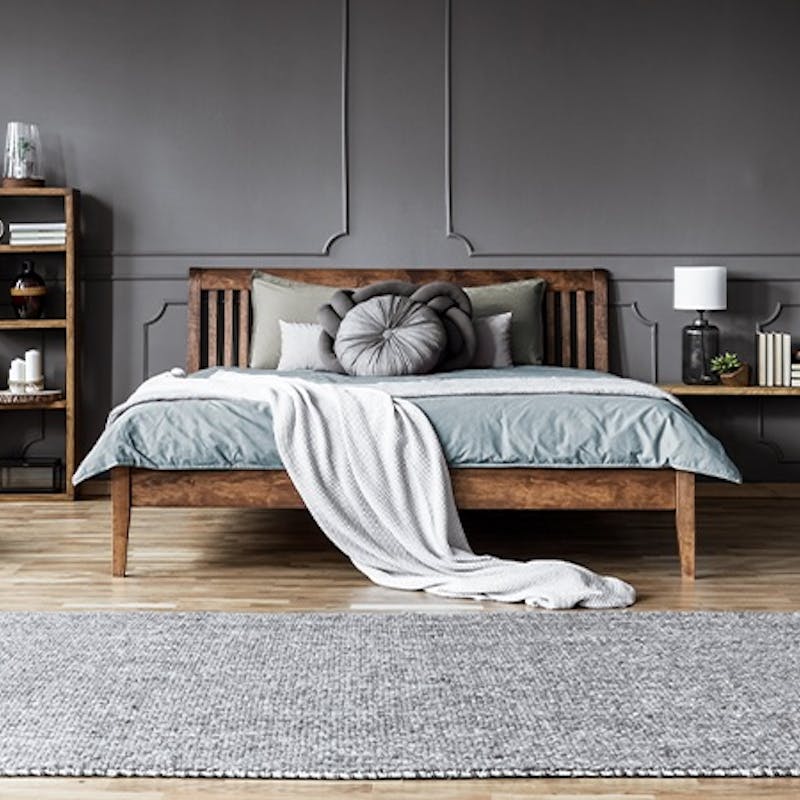 A bed frame and blanket give this bedroom an old-fashioned feel. Further, it will fit perfectly with contemporary wall lights and mid-century bedside tables.
